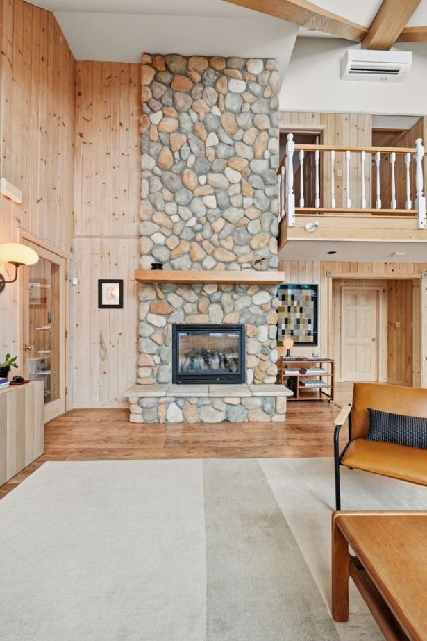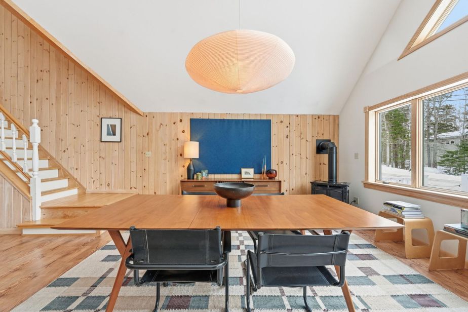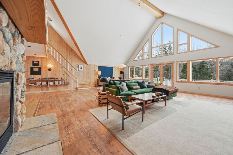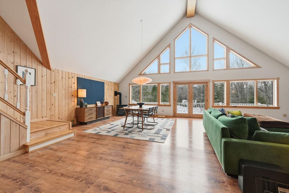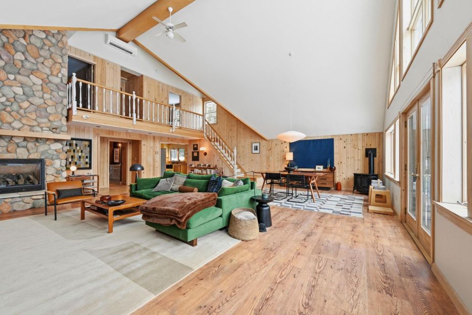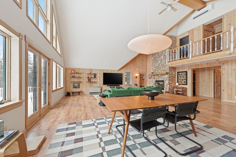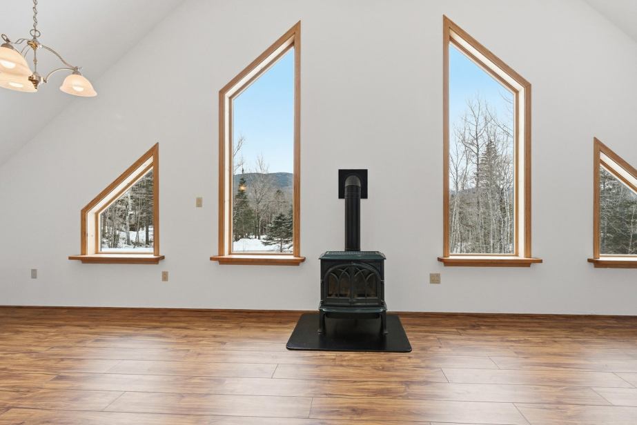 The main living area features soaring cathedral ceilings, expansive windows that capture natural light and mountain views, and a towering fieldstone fireplace that anchors the great room. An open-concept layout flows into the dining area with a cozy parlor stove and a well-appointed kitchen — ideal for entertaining après-ski or hosting holiday gatherings.
